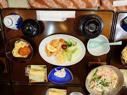 スパゲッティやフライなど皆さんの好物が盛り込まれた夕食です。お料理に舌鼓を打ちながら、美味しくいただきましょう。