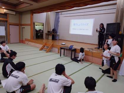 係の皆さんがレクリエーションの進行を務めます。周りの仲間が協力し、楽しい雰囲気を作っています。お互いに支え合う気持ちが嬉しいです。