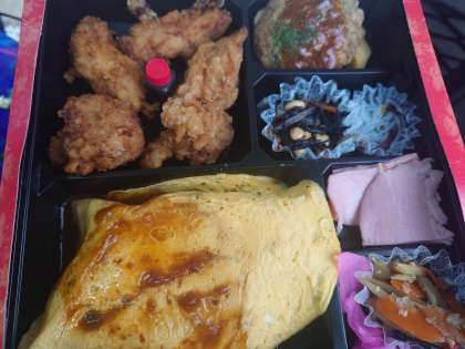 本日の昼食はフライドチキン・ハンバーグにオムライスが入ったボリューム満点のお弁当です。