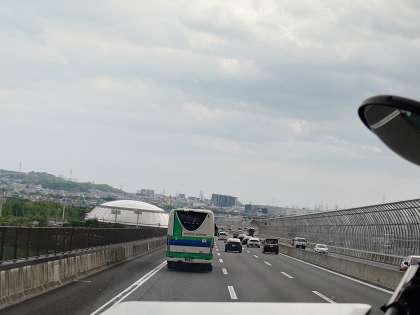 バスは大阪府に入りました。遠くにハルカスが見えています。