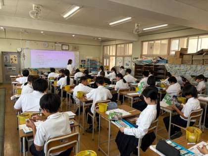 1年の美術では、初めて絵の具での彩色を始めます。その前に机の上に絵の具などを準備します。正しい置き方は?
