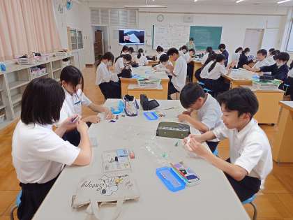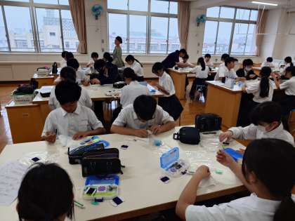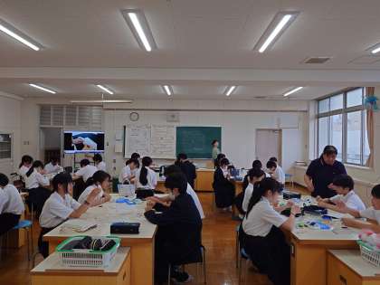 1年生の皆さんが被服室でお裁縫の実習を行っています。今日は仮縫いなどで用いる「並縫い」を練習します。布を等間隔で縫う基本的な縫い方とのこと。布をピンと張ると縫いやすいそうですよ。皆さん頑張りましょう!