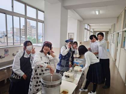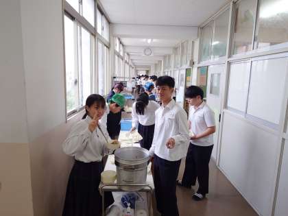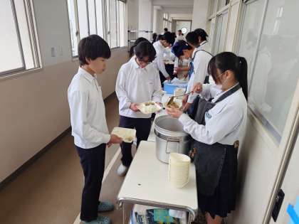 午前の授業が終わり、3年生の教室前で給食の準備が始まりました。今日は「麻婆春雨・チンゲン菜とモヤシの甘酢和え・炒り黒豆」の中華メニュー。3年生の皆さんには修学旅行後、初めての給食になりますね。みんなで美味しくいただいてくださいね。