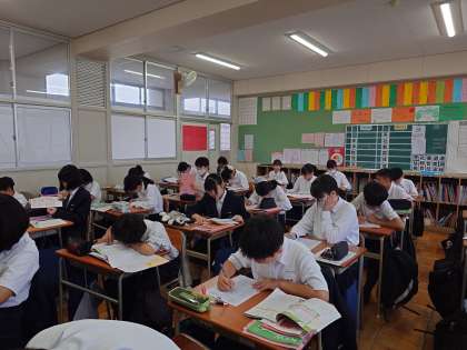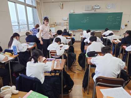1年生の皆さんが「be動詞」の復習プリントに取り組んでいます。授業では「am・is・are」を中心に教わりました。She や You など、主語によってbe動詞が異なるので使い方に注意してくださいね。