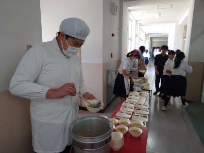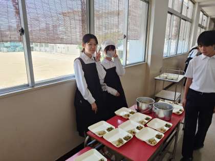 お昼休みのチャイムが鳴り、2年生の皆さんが給食の準備を進めています。今日は「鶏のカレー風味焼・豚と根菜のスープ・ツナと三度豆のソテー」の洋風献立。カレー粉やガーリックで下味をつけて焼き上げた鶏肉は香ばしくて美味しそう。パンと一緒にいただきましょう。
