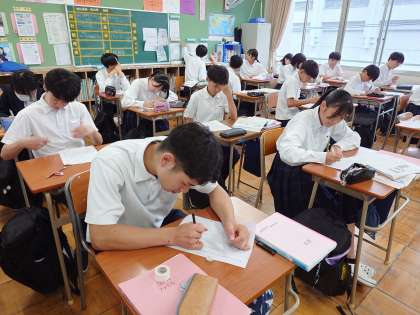 3年生の皆さんが作文に取り組んでいます。これまで長谷川櫂さんの論説文「間の文化」を学習してきました。今日は「日本の文化は〇〇の文化」をテーマに自分の考えを作文にまとめます。おもてなしや敬語、四季折々の行事など、いろいろと浮かびますね。