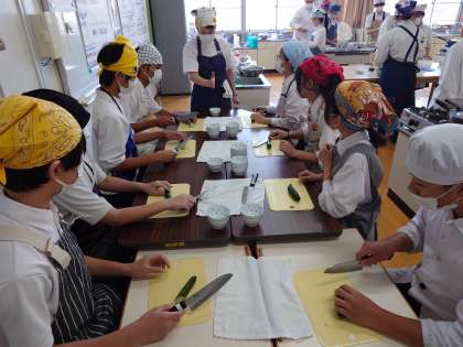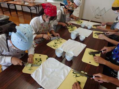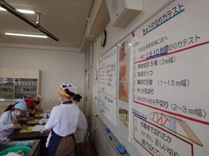 調理実習と並行して「キュウリの切り方」の実技テストが行われています。斜め切り・輪切り・乱切りなど、キュウリをさまざまな形に切っていきます。薄すぎず、厚すぎず、適度に切るのは難しいですね。
