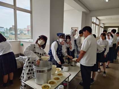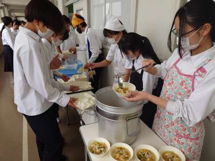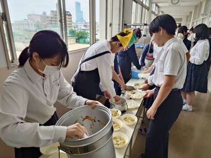 お昼休みのチャイムが鳴り、3年生の教室前で給食の準備が行われています。今日のメニューは「豚のごま味噌焼き・鶏と薄揚げの五目汁・ツナとモヤシの炒め物」。豚肉と玉ねぎ、ピーマンをねりごまや赤味噌で味付けしたごま味噌焼きは白いご飯に合いそうですね。