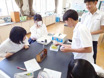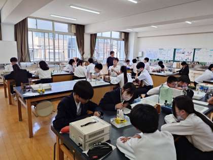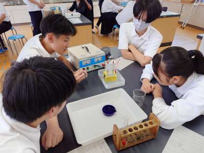 3年生の皆さんが理科室で何やら実験中。塩酸を電気分解して発生する気体を調べるそうです。化学反応式で「2HCL→H2+CL2」となり、陰極では水素ガスが発生します。火のついたマッチを近づけると、ポンと音を立ててマッチが燃えましたね。
