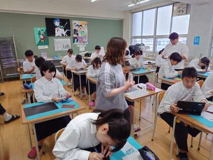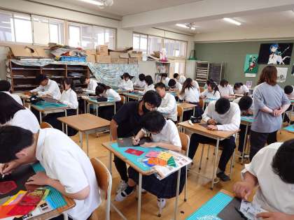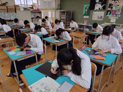 3年生美術の授業で切り絵の制作に取り組んでいます。好きな音楽(楽曲)のワンシーンを切り絵で表現する作品づくり。アイディアスケッチも出来上がり、彫刻刀を使った工程に進んでいます。ケガしないように注意しながら、皆さん慎重にていねいに作業しています。ステキな作品が出来ると良いですね。