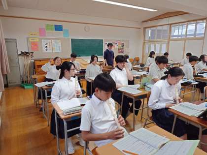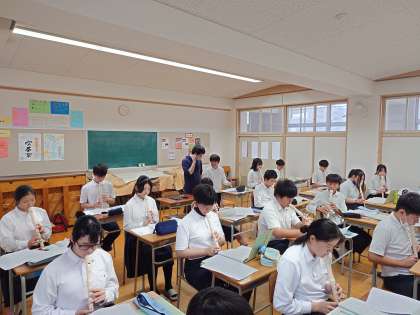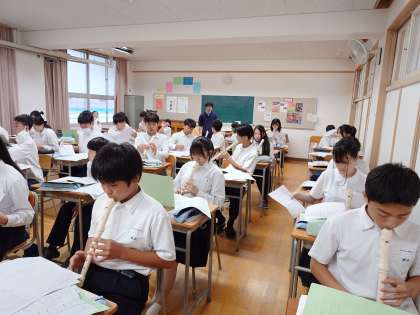 2年生音楽の授業でまもなく「リコーダーテスト」が始まります。今はテストの前にみんなで課題曲を演奏中。一度練習しておくと、テスト本番でのミスを防げそう。満足いく演奏となるよう、皆さん頑張ってください!