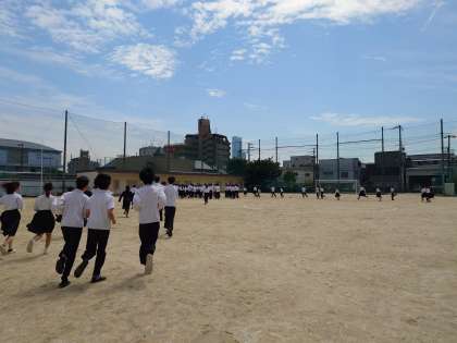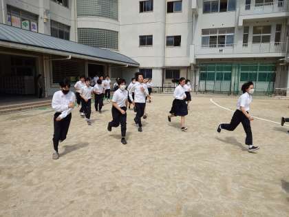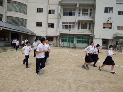 (大きな揺れが収まり)全校生徒が運動場へと避難してきました。駆け足で集合場所へと急ぐ姿は、真剣に取り組む気持ちが感じられて良かったです。いつ地震が発生しても、適切に対応できる心の準備が大切ですね。