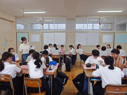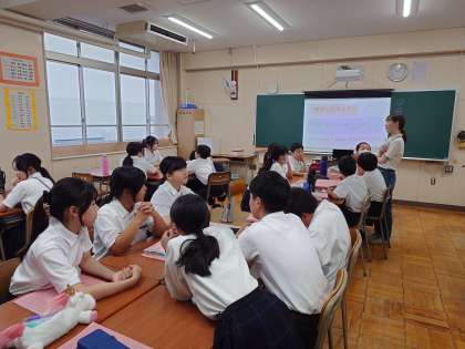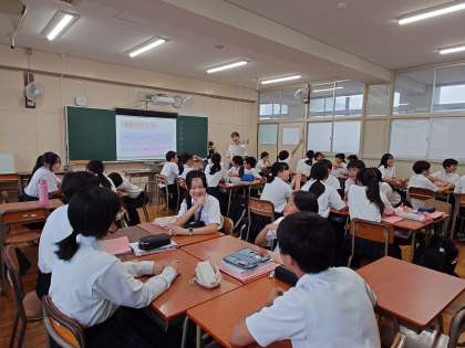 1年生国語の授業でグループディスカッションを行っています。あるテーマについて議論を行い、時間内に結論を導きます。今日のテーマは「学校にあったら嬉しいもの」。皆さん、いろんな意見を出し合って議論を盛り上げています。