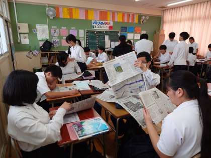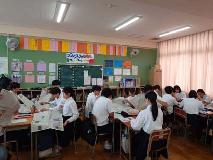 3年生の皆さんが「クロヌリハイク」に挑戦します。新聞記事の文章を黒く塗りつぶし、俳句を浮かび上がらせる作品だそうです。今日はグループ毎に俳句になりそうな言葉が入っている記事を探します。皆さん、上手く記事が見つかりましたか?