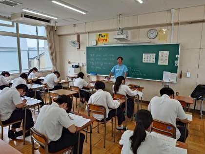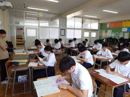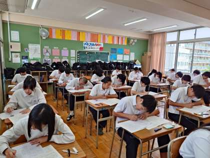 3年生の教室では社会科のテストが行われています。日清戦争や日露戦争など、19世紀末〜20世紀初頭の日本や世界のようすについて出題されている模様。授業で教わった内容をよく思い出して、1問ずつ着実に解いていきましょう。