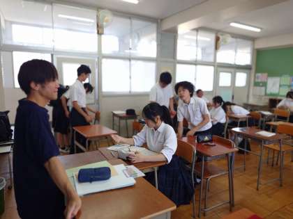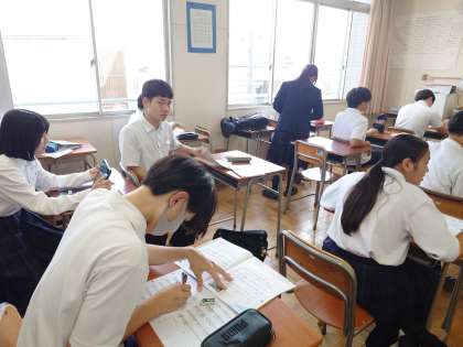 3年生の教室でも和やかにテスト前の学習が行われています。今日は「理・英・音」のテストを予定しています。設問をよく読んで、何が問われているか的確に理解した上で回答することが肝心。3教科ともに集中力を保つのは大変ですが、気合いで乗り切ってください。