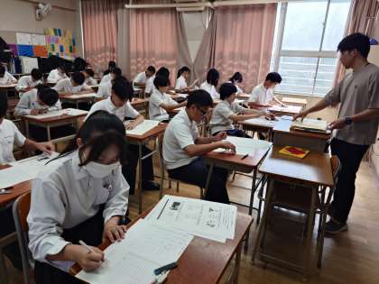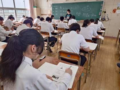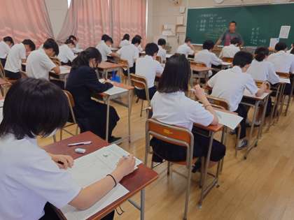 1時間目「英語科」のテストが始まりました。まずはリスニングテストから。スピーカーから流れる音声に集中して問題を解いていきます。英文を聞いて、説明に合うイラストを1つ選びます。キーワードを聞き取り、問題用紙にメモするのも上手く解答するポイントです。2年生の皆さん頑張ってください!