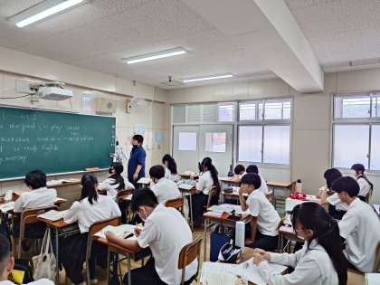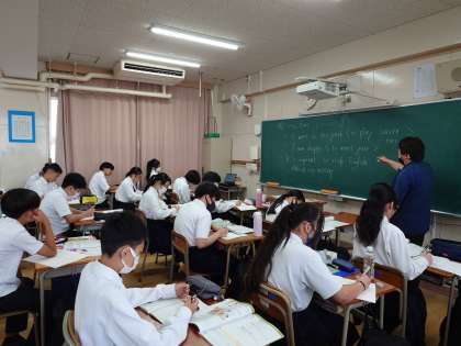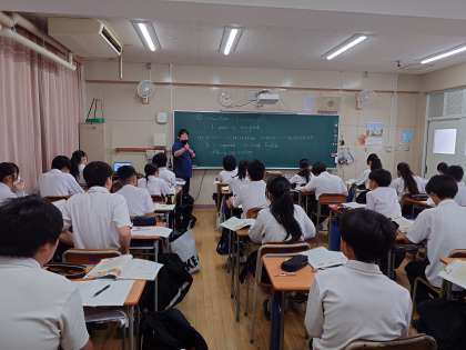 2年生英語の授業で「不定詞」の用法をおさらい中。不定詞は、動詞の原形に「to」をつけたもの。名詞的(〜すること)・形容詞的(〜するための)・副詞的(〜するために)などの用法があるそうです。それぞれの用法を使った英文を考えてみましょう。