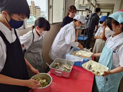 お昼休みのチャイムが鳴り、1年生の教室前で給食の配食が行われています。今日は「サゴシのおろし醤油がけ・野菜炒め・お味噌汁」の和風献立。サゴシは鰆(サワラ)の幼魚で、クセの無いあっさりとした味が特徴とのこと。おろし醤油でさっぱりと味付けしたサゴシは美味しそうですよ。