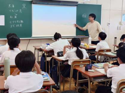 1年生社会科の授業で「アジアの自然環境」について学習中。中央アジアは乾燥した土地が広がり、中国のタクラマカン砂漠は広さが日本の約4倍もあるそうです。冬には雪が積もることもあり、私たちがイメージする砂漠とは少し異なるかもしれませんね。