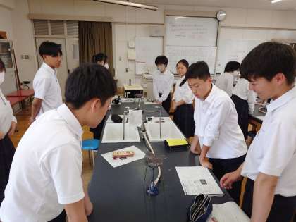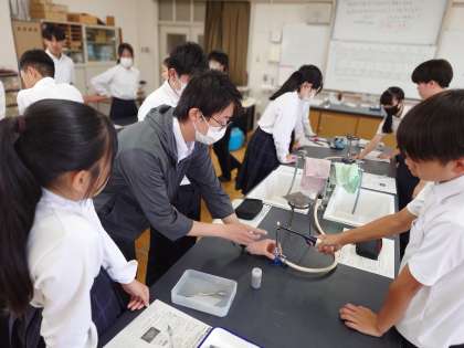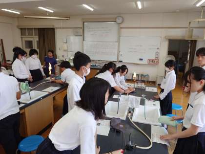 2年生の皆さんが理科室で何やら実験中。マグネシウムをバーナーで燃焼させて、燃焼前と燃焼後の物質(酸化マグネシウム)の質量の変化を調べます。テーブル毎に質量が異なるマグネシウムが配られ、実験が始まりました。どんなデータが出てきましたか?