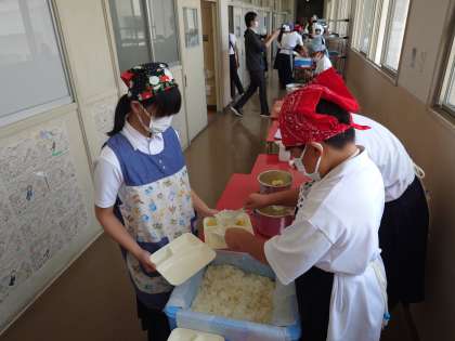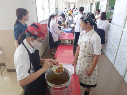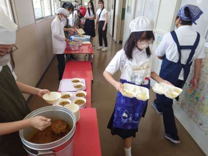 お昼休みのチャイムが鳴り、1年生の皆さんが給食の準備を始めました。今日は「夏野菜のカレーライス・サワーソテー・洋梨」の人気メニュー。キャベツとコーンを炒めワインビネガーで味付けしたサワーソテー。爽やかな酸味が美味しいですよ。カレーもお替りしてくださいね。