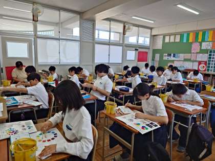 1年生美術の授業で「色相環」を作っています。基本となる色を環状に配置した図を色相環と呼び、色の構成や特徴が分かるとのこと。色相環で向かい合う色を「補色」といい、互いに色のバランスや鮮やかさが際立つそうです。色の関係もいろいろとあるようです。