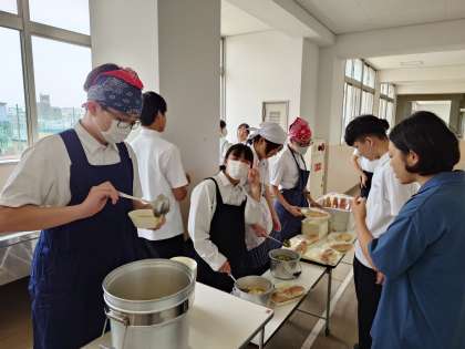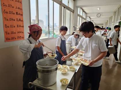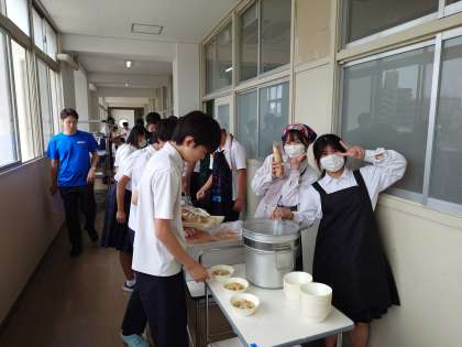 お昼休みのチャイムが鳴り、3年生の教室前で給食の準備が始まりました。今日は「鶏と野菜のスープ・ジャーマンポテト・キュウリとコーンのサラダ」の洋風メニュー。ホクホクのジャガイモにベーコンのうまみが効いたジャーマンポテト。よければお替りしてくださいね。