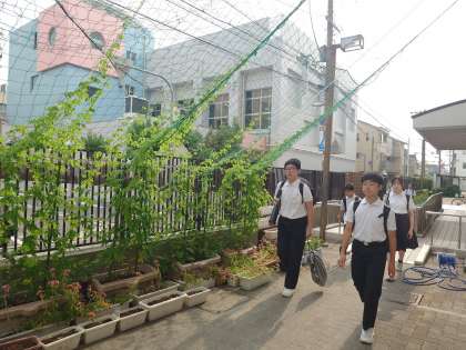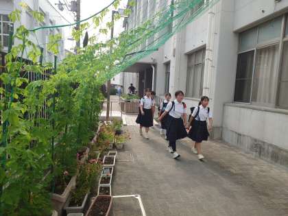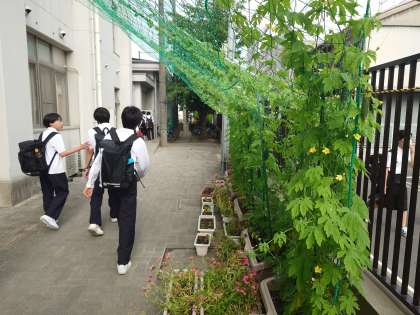湿気を含んだ重たい空気に包まれる朝。今日も暑い中、皆さん元気に登校してきました。校内緑化の一環として植えられたゴーヤの苗がスクスクと育ち、黄色の花を咲かせています。もう少し成長すれば、緑のカーテンができそうですね。