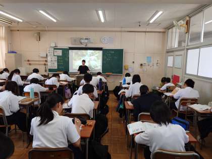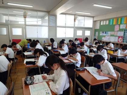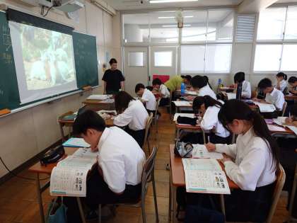 1年生家庭科の授業で衣類の素材(繊維)について学習中。大きくは動物や植物由来の天然繊維と、石油を原料とする化学繊維に分かれるそうです。植物繊維の綿は、吸水性や肌ざわりが良く、Tシャツなどに使われますね。どんな素材があるか、調べてみましょう。