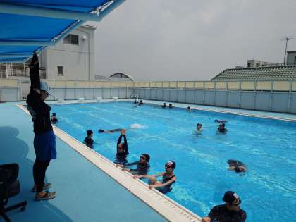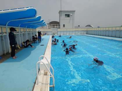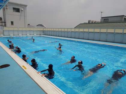 校舎屋上のプールでは、2年生女子が水泳の授業を受けています。まずは「蹴伸び」の練習から。手先から足先までを一直線に保ち、プールの壁面を蹴って真っすぐに進みます。姿勢が良いと、気持ち良く水面を進めます。皆さんフラットな姿勢が意識できましたか?