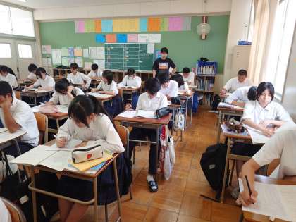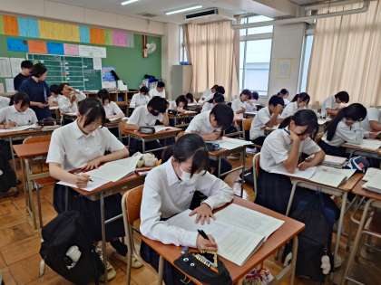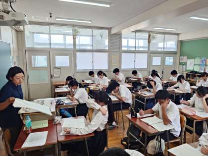 3年生社会科で過去のテスト問題に取り組んでいます。テスト問題は各分野や単元のポイントとなる事項が出題されているので、復習・見直しをするのにピッタリの教材です。夏休みに向けて自身の弱点の発見・克服に活かしましょう!