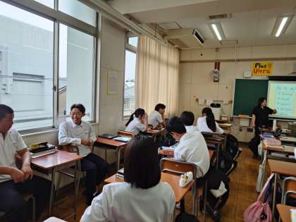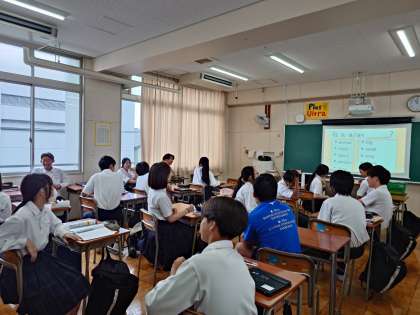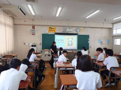 3年生の授業にC-NETのベイヤー先生が来られ、英語のゲームを楽しみました。2人ずつペアになってスクリーンに映されるイラストを予想するゲームです。解答者は何のイラストか知らないので、相方が懸命に英語でヒントを説明します。お互いに英語のやりとりが出来て正解となるでしょうか?