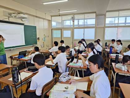 1年生英語の授業でビデオ教材を視聴しています。「What is that? (それは何ですか)」など、what を使った英文を学習します。スクリーンでは、what の使い方をわかりやすく説明中。映像を見て学習するのも楽しそうですね。