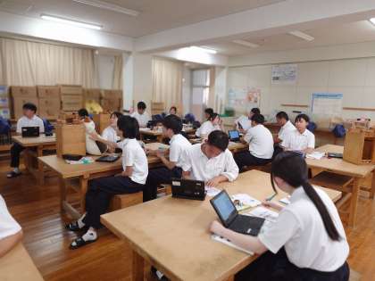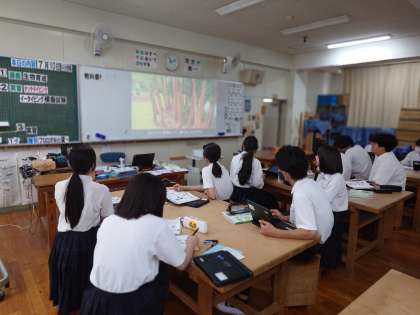 3年生技術科で「栽培」について学習中。今日はバナナの栽培に関するビデオを視聴します。バナナは種をまいて育てるのではなく、親株から生える子株を株分けして苗を育てるそうです。成長も早く、約15カ月で収穫できるとのこと。皆さんはバナナは好きですか?