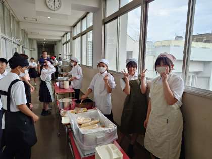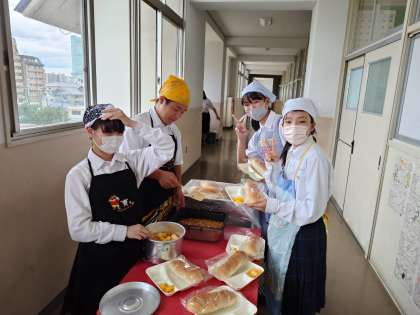 午前の授業が終わり、1年生の教室前で給食の準備が始まりました。今日は「チキンパエリア・ウインナーとキャベツのスープ・ミックスフルーツ」の洋風献立。パエリアはスペインで生まれたお料理。魚介系のパエリアが有名ですが、今日はチキンとお野菜を具材に炊き込みました。皆さん、お味はいかがですか?