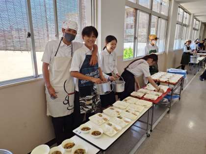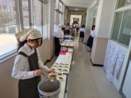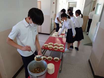 午前の授業が終わり、2年生の教室前で給食の準備が行なわれています。今日のメニューは「牛丼・モヤシとピーマンのゴマ炒め・大福豆の煮物」です。牛肉と玉ねぎ・ニンジンを甘辛く煮込んだ牛丼はおつゆも美味しそう。お好みで「つゆだく」も出来そうです。