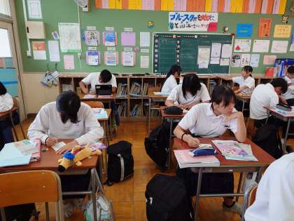 2年生で行われていた「暑中見舞いハガキ」の作成を3年生も取り組んでいます。これまでに何度が書いてきたので、宛名や差出人の記入はスムーズにできている模様。後は裏面(文面)の文章に頭をひねります。日頃お世話になっている方へのお礼や自身の近況など、いろいろと書いてみましょう。