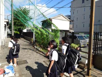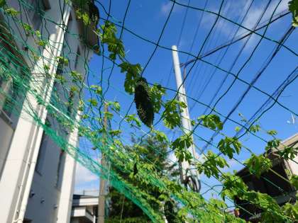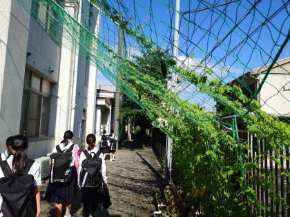 校門西側で栽培しているゴーヤが可愛らしい実をつけています。小さい子どもの拳(こぶし)くらいのサイズですが、形状はゴーヤそのもの。夏休みに登校した時に観察してくださいね。