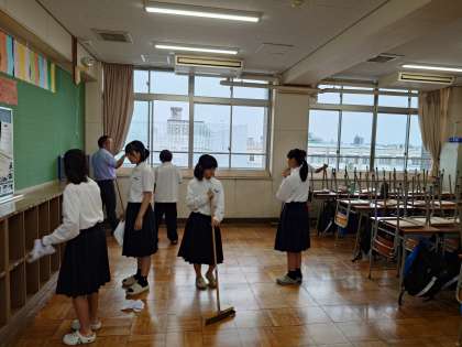 全学年一斉の大清掃が始まりました。あいにくの雨で校舎周辺のそうじはできませんが、1年生の皆さんが教室や学年のフロアをみんなでお掃除しています。みんなで協力して取り組んでいる様子に感心します。