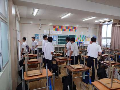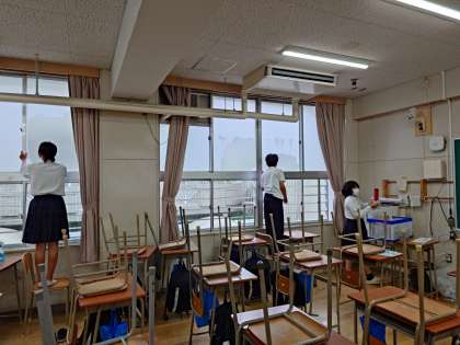 2年生の皆さんも大清掃を頑張っています。ふだん行わない窓やドアの雑巾がけにも取り組むとのこと。雑巾で乾(から)拭きすると、汚れの広がりを防ぐ効果があるそうですよ。みんなでやってみましょう。