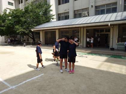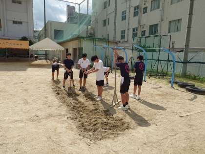 陸上部の皆さんが活動前の準備を進めています。走り幅跳びの練習場所では、トンボやスコップを使って砂場の土を柔らかく耕します。短距離走のスタート地点では、ハンマーを使ってスターティングブロックをセットします。準備が済んだらアップ走から。皆さん今日も頑張りましょう!