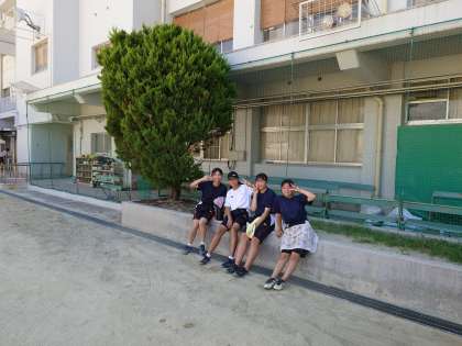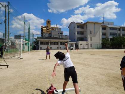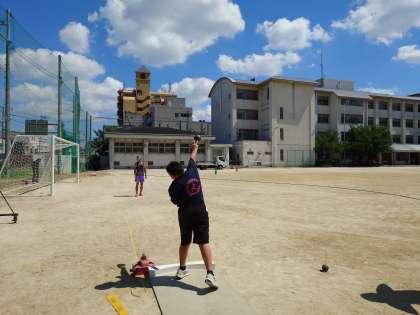 運動場の西側では「砲丸投げ」を練習しています。顧問の先生からアドバイスを受け、一投ずつフォームを調整していきます。暑さが厳しい中、こまめに休憩・給水を取りながらの練習です。明日の大会で桃中陸上部の皆さんが好成績を上げるのを楽しみにしています。