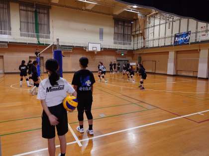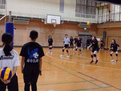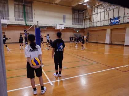 体育館から元気な声が聞こえてきました。女子バレーボール部が練習試合を行っています。日頃の練習の成果を実践で試します。サーブやレシーブ、アタックなど、状況に応じた対応や動きができているかをみんなで確かめます。今後のゲームに活かせるよう頑張りましょう。