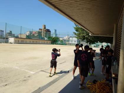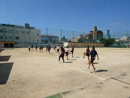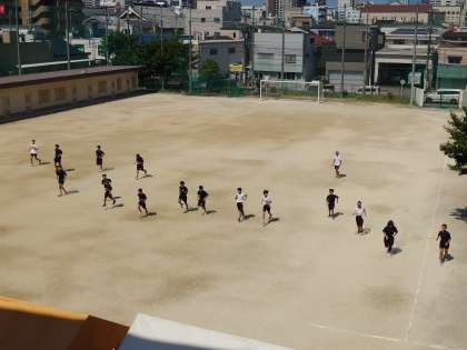 運動場では陸上部の皆さんの練習が始まりました。まずは全体でウォーミングアップから。しっかりと腿(もも)を上げて身体を目覚めさせます。ここ数日は暑さが厳しいので、休憩・給水をこまめにとりながら、自身の目標にむけて力を高めましょう。
