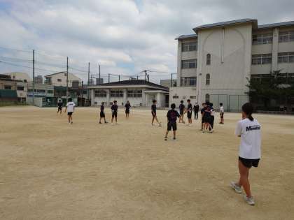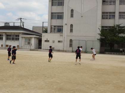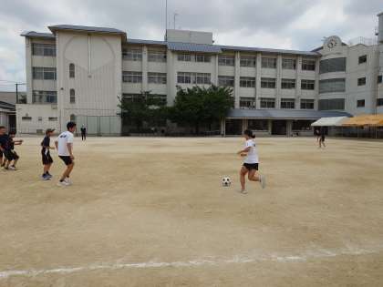 ティーバッティングを試した後は、陸上部のみんなでサッカーを楽しみます。ドリブルやパス回し・シュートなど脚を使った動きはさすがに慣れたようすです。ずっと走り回っているので、けっこうな練習量になりそうです。