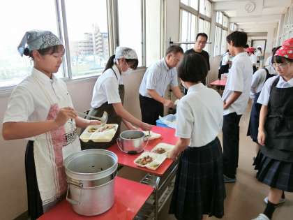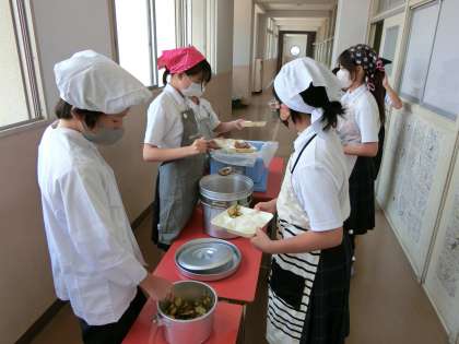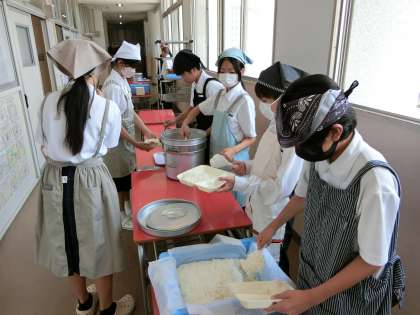 今日から給食が再開しました。1年生の教室前では配食の準備がすすんでいます。今日は「マーボー厚揚げ丼・キュウリの中華和え・ぶどうゼリー」の中華献立。豆板醤で味付けされたマーボ厚揚げはナスや玉ねぎ、ニラなどの野菜もたっぷり。ご飯にかけていただいてくださいね。