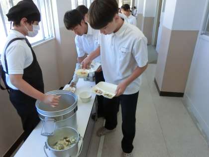 午前の授業が終わり2年生の教室前で給食の準備が始まりました。今日は「鶏のバジル焼き・ベーコンと野菜のスープ・キャベツとキュウリのサラダ」の洋風献立。バジルはパスタやピザなど、イタリア料理でよく使われるそうです。さわやかな特有の香りが鶏肉の味を引き立てますね。