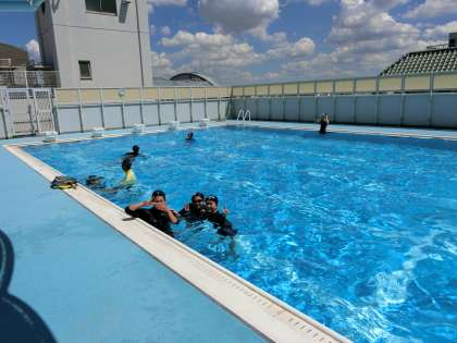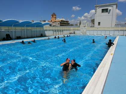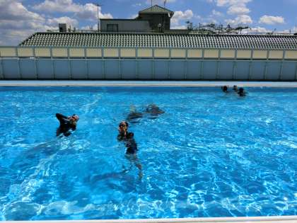3年生女子体育で水泳の授業が行われています。今は次回のテストにむけた自由練習の時間。それぞれが泳ぎのフォームを確かめながら、ゆっくりと練習に励んでいます。プールの水は少しぬるめだそうですが、皆さん気持ちよく泳いでいますね。