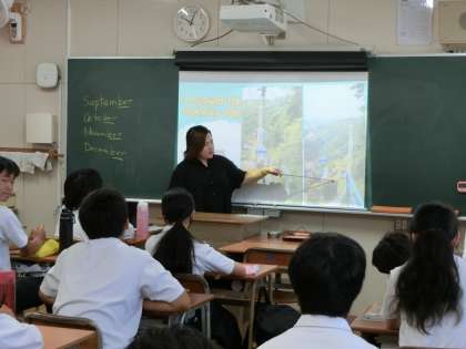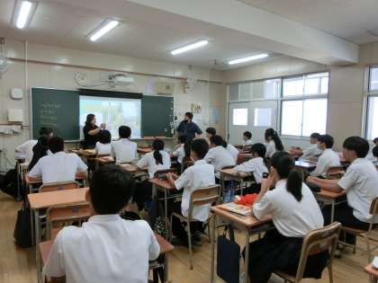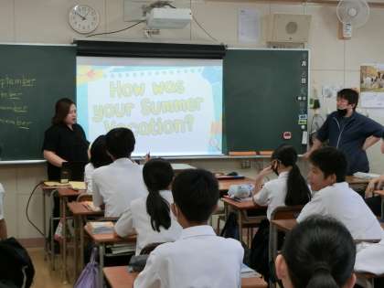 2年生英語の授業にC-NETのベイヤー先生が来られました。先生はこの夏休みに神戸の須磨に行かれたそうです。スライドには須磨でのようすが映され、英語でいろんなお話をしてくださいました。続いて先生から「皆さんの夏休みはいかがでしたか?」との質問が。皆さん、英語でお話してくださいね。